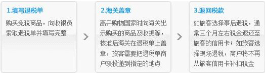 在境外购物时,可享有免税店商品退税优惠。只要旅客购买一定金额的商品,并在一定 时间内把购买的商品办理离境,旅客就有权申请退税。旅客可以选择现场退税或事后退税的方式享受商品退税优惠。现场退税,即在购买免税商品时仅支付商品净价格(不含增值税),但旅客在离境时务必办理退税手续,否则商户有权从您提供担保的信用卡中补扣税金。事后退税,即在购买免税商品时支付含税价格,在旅客离境办理退税手续后商户再把税金返还至旅客指定的信用卡中。